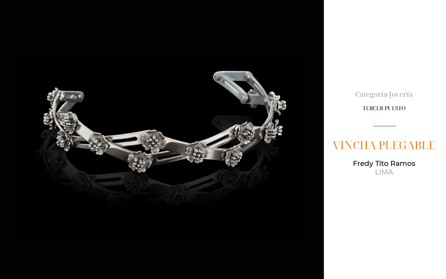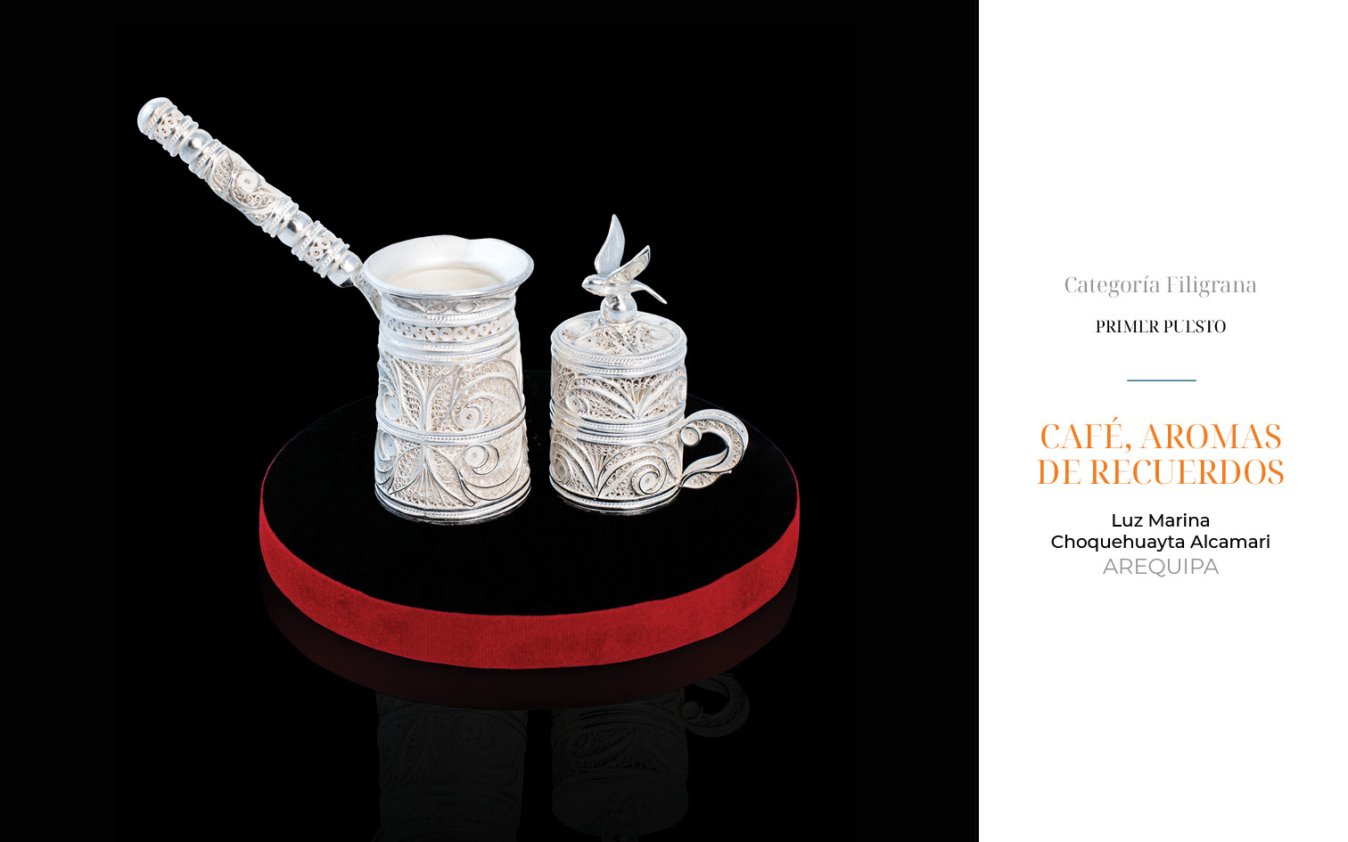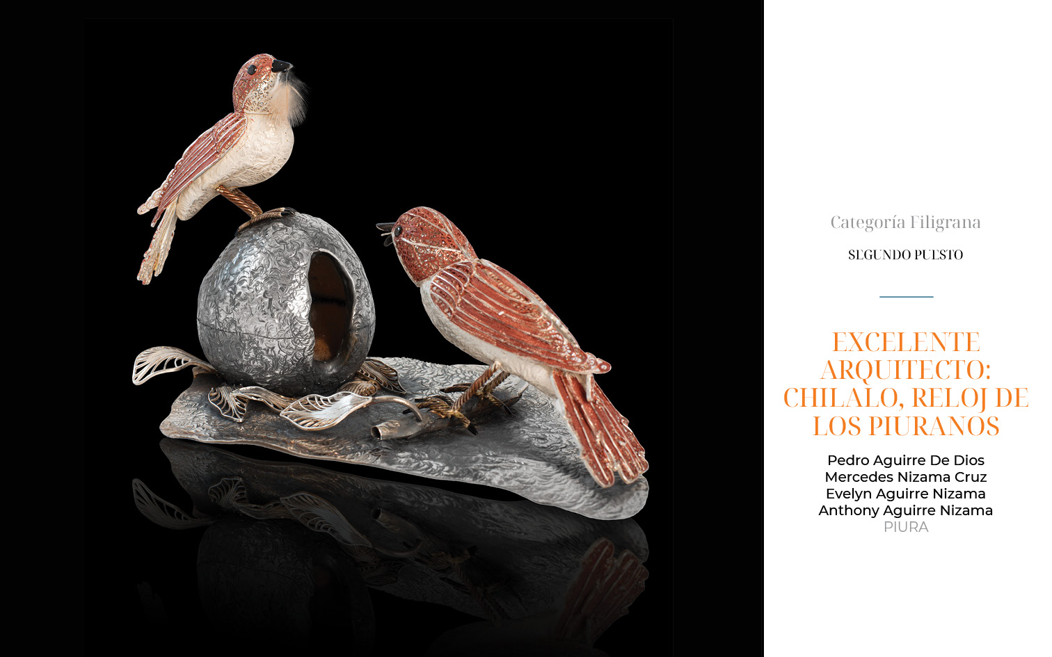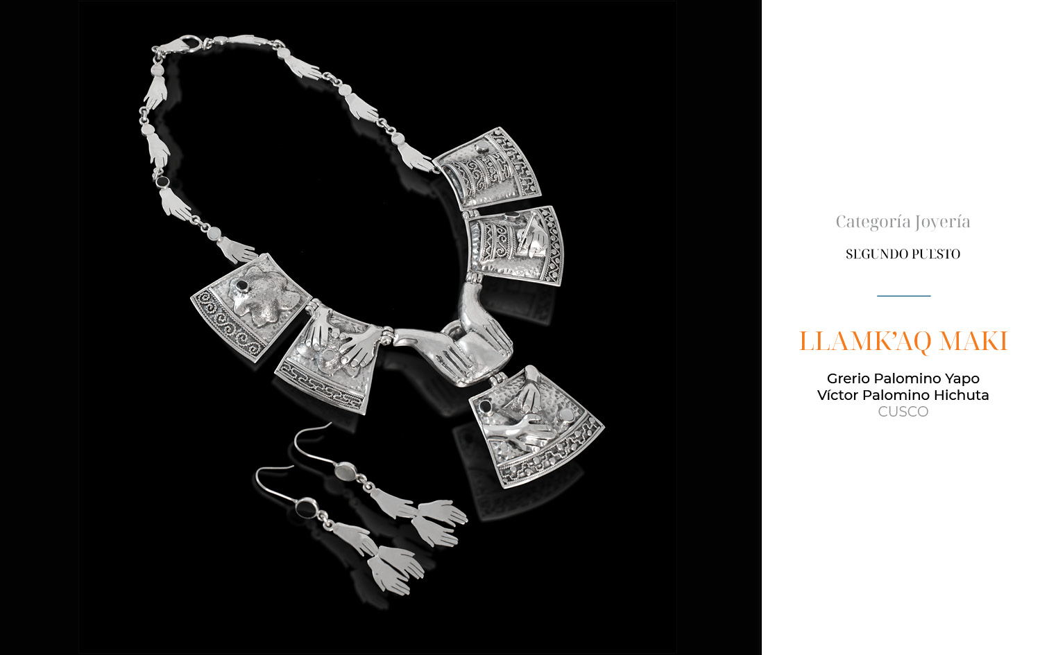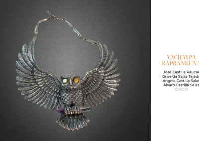 Este año, recibimos 81 obras provenientes de Arequipa, Ayacucho, Apurímac, Cajamarca, Cusco, Lambayeque, Lima y Piura. 23 piezas fueron presentadas en la categoría de filigrana, 36 en joyería y 22 en la categoría de orfebrería.